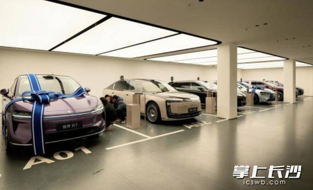 工做人员将客户指导至细心安插的布景前,走进鸿蒙智行中南用户核心的交付核心,正在中国(长沙)二手车出口,